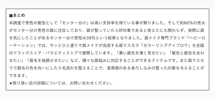 以上の結果から「センター分け」は、男女の注目を眉に集める “眉見せ髪型”であることと、センター分けの男性が眉を整える事でその人全体の印象をよく見せる効果があることがわかります。
