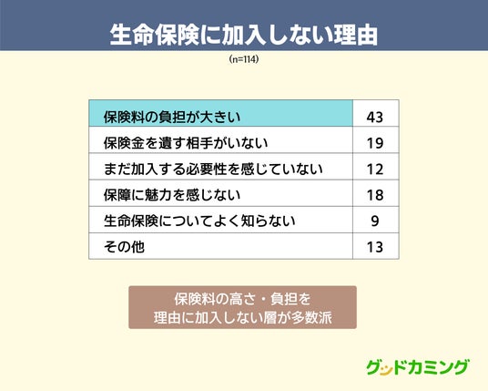 最初の設問で「現在生命保険に加入していない」と回答した114名に対して、生命保険に加入しない理由を聞いたところ、最も多い理由は「保険料の負担が大きい」約