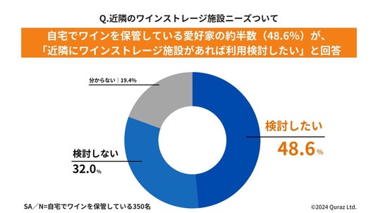 近隣にワインストレージ施設があれば利用したいか調査したところ、約半数(48.6%)が利用検討したいと回答 。また、自宅のワインスペースに不満を抱く愛好家にも同様の問いをすると、