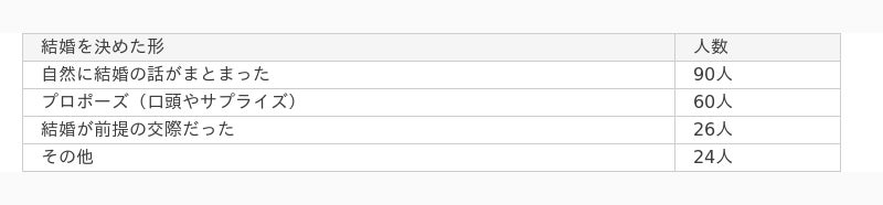 今回の調査では、「自然に結婚の話がまとまった」と回答した方が最も多く(90名)、全体の中心的なパターンとなっています。続いて「プロポーズ(口頭やサプライズ)」が60名、「結婚が前提の交際だった」が26名と続きました。「その他」の24名は、具体的には「親のすすめ」や「勢いで入籍を決めた」など、上記以外の経緯で結婚を決断したケースと考えられます。