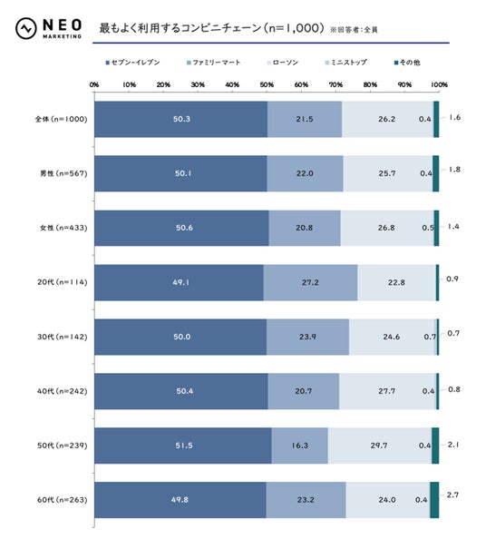 年代別では「ローソン」が20代22.8%→50代29.7%へ緩やかに伸びる一方、「ファミリーマート」は27.2%→16.3%へと減少しており、年齢が上がるほど「ローソン派」が増える傾向がうかがえます。