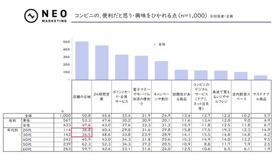40代以上では「近くにあるため」に50%以上、「24時間営業だから」に30%前後集まった。