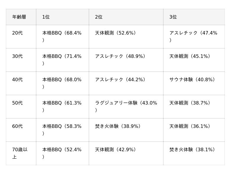 3. 全世代で「本格BBQ」が1位、50代のみ「ラグジュアリー体験」が2位に