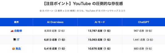 全 9 パターン(3 業界 × 3 AI 検索)のうち、YouTube が 8 パターンでトップ 3 入りを果たした。特に AI モードでは全業界で 1 位を獲得。