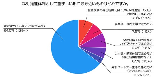 もっとも多かったのは「まだ決めていない/分からない」で、64.5%(129人)と全体の約3分の2を占めました。導入方針だけでなく、どのような体制で推進すべきかについても明確な答えを持てていない企業が多く、